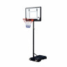 Детская мобильная стойка для игры в баскетбол с щитом из полиэтилена. Для установки в помещении и на улице. В основание размерами 75 х 45 х 13 см необходимо залить воду или засыпать песок объёмом 0,043 м 3 (а именно 43 литра). Телескопическая регулировка высоты от 165 до 260 см (по кольцу). Диаметр стойки (трубы, к которой крепятся щит и основание) составляет 4,5 см. Баскетбольное кольцо 38 см, цвет оранжевый. Всепогодная нейлоновая сетка в комплекте.